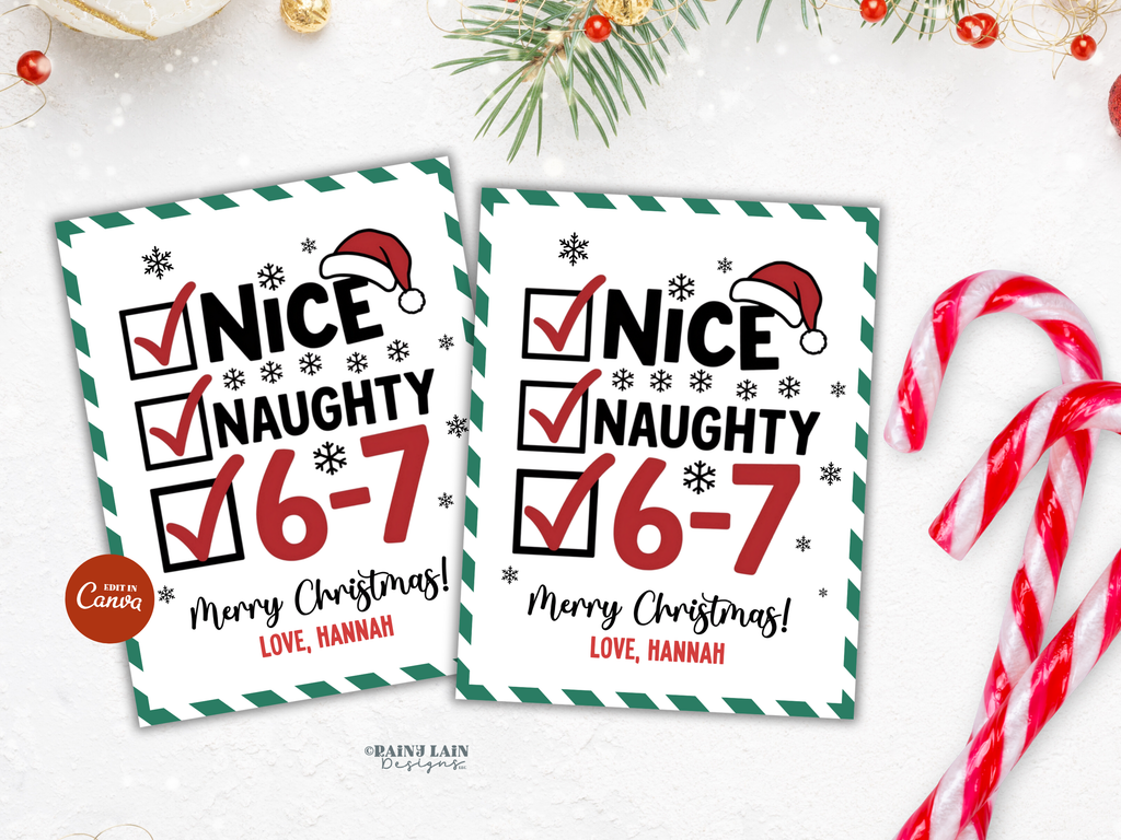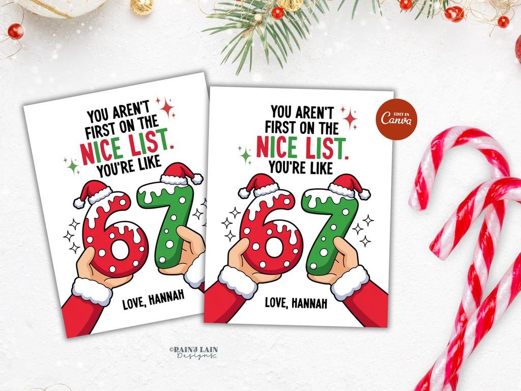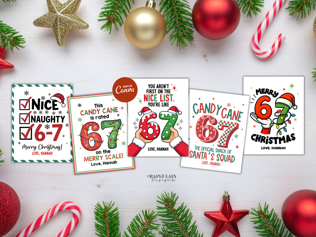 Make holiday gifting extra fun with this 67 Christmas Candy Cane Holder Tag Set — a playful, kid-approved collection of 5 editable designs featuring the “67” saying children love. These tags are quirky, funny, and guaranteed to get a laugh.