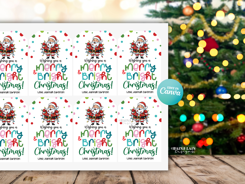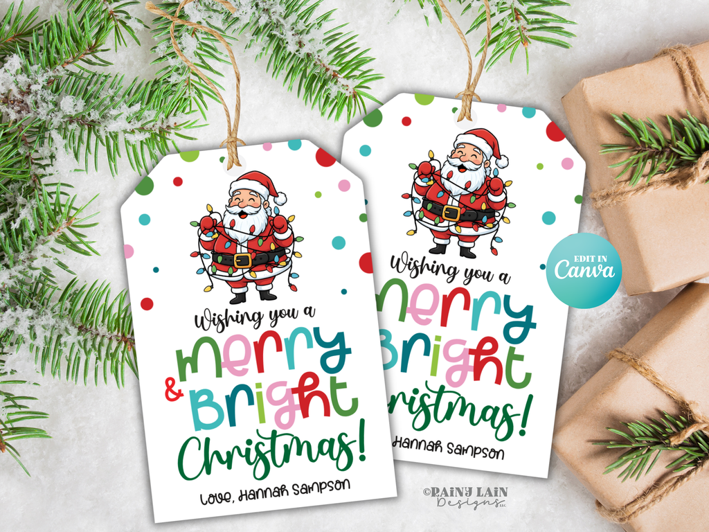 Christmas Lights Gift Tag, Merry and Bright Holiday, Printable, Editable in Canva