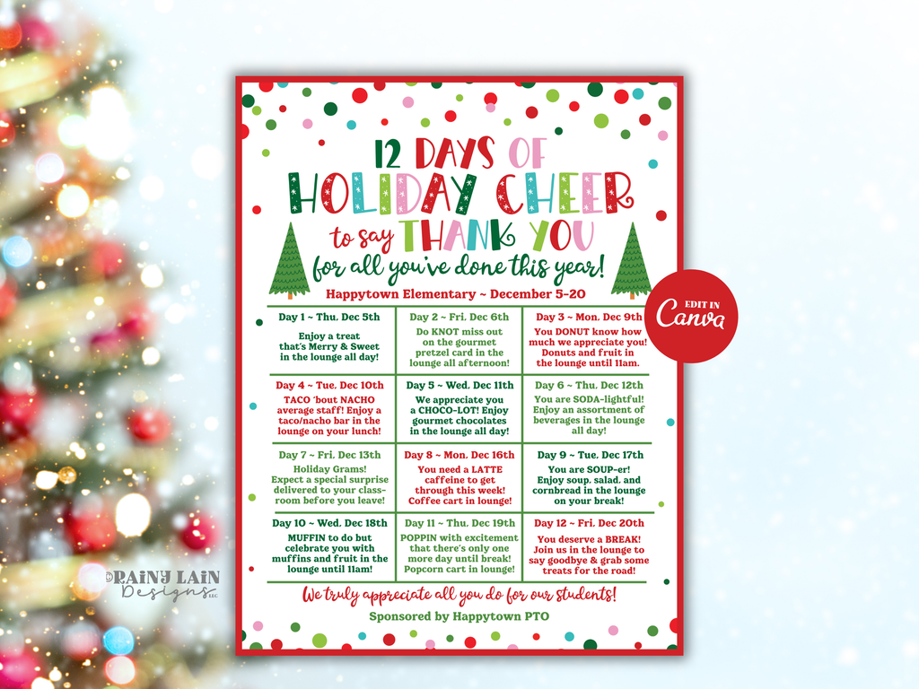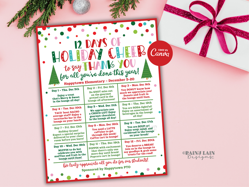 Editable Christmas Holiday Appreciation Flyer Template, 12 Days of Holiday Cheer, Christmas Calendar, Teacher School PTO PTA Event Itinerary