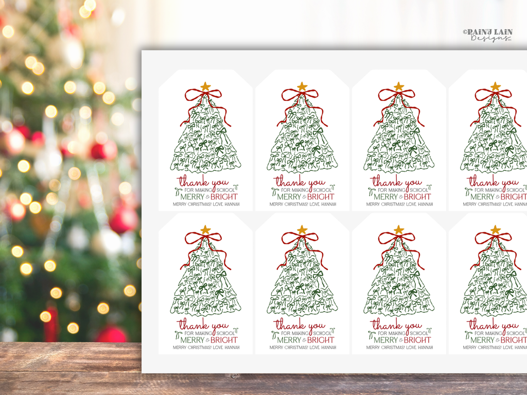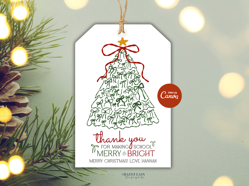 Spread holiday cheer with this Merry and Bright Gift Tag Template! Featuring a hand-drawn coquette bow tree design, this editable Canva template is perfect for teacher gifts, staff appreciation, and Christmas presents. Easily customize the text for a personal touch and print at home for a festive Merry Christmas thank you tag. A beautiful way to add charm and warmth to your hand-drawn Christmas gift tags.