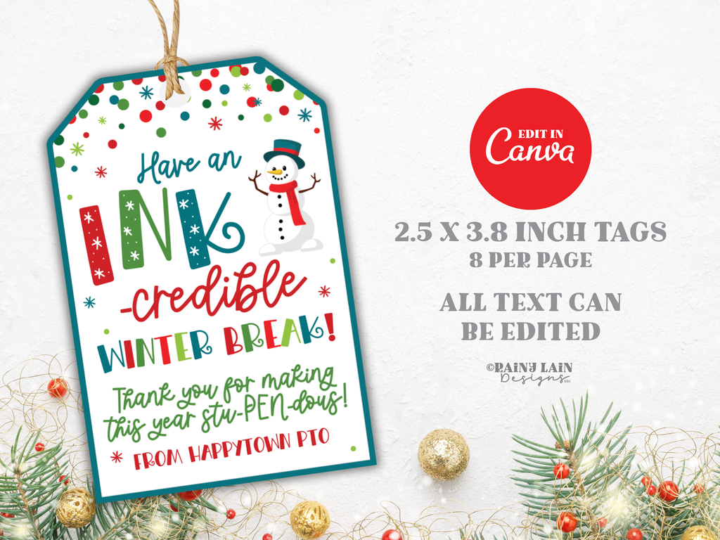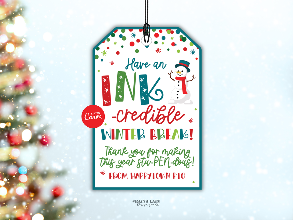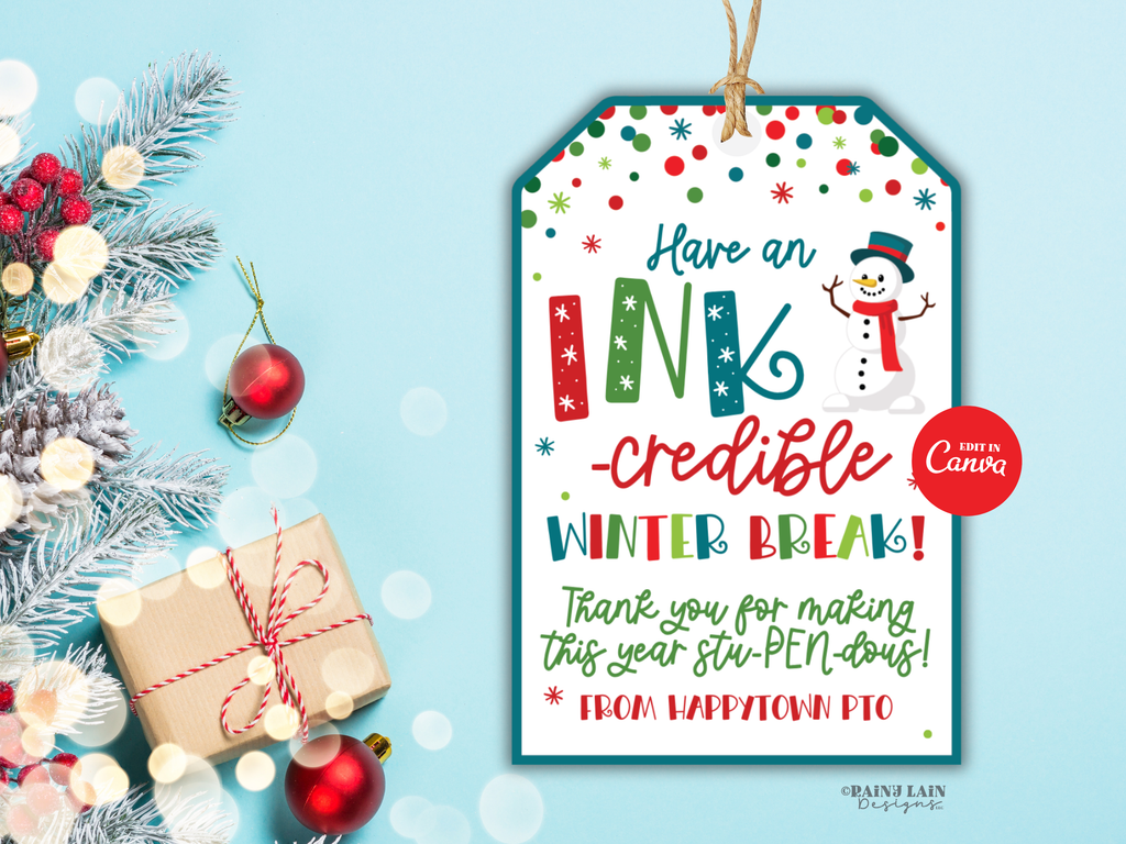 Teacher Gift Pen, Winter Break Classroom Gift Tag, Editable in Canva