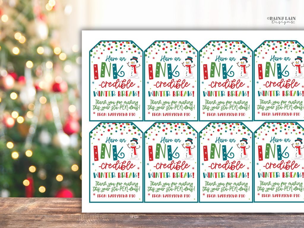 Customize the name or message in minutes, print at home or school, and attach to your favorite pen for a quick and festive winter break send off. Whether you're organizing classroom gifts, planning a staff appreciation moment, or helping your child share a small holiday surprise, this printable tag makes gifting simple, cute, and stress-free.