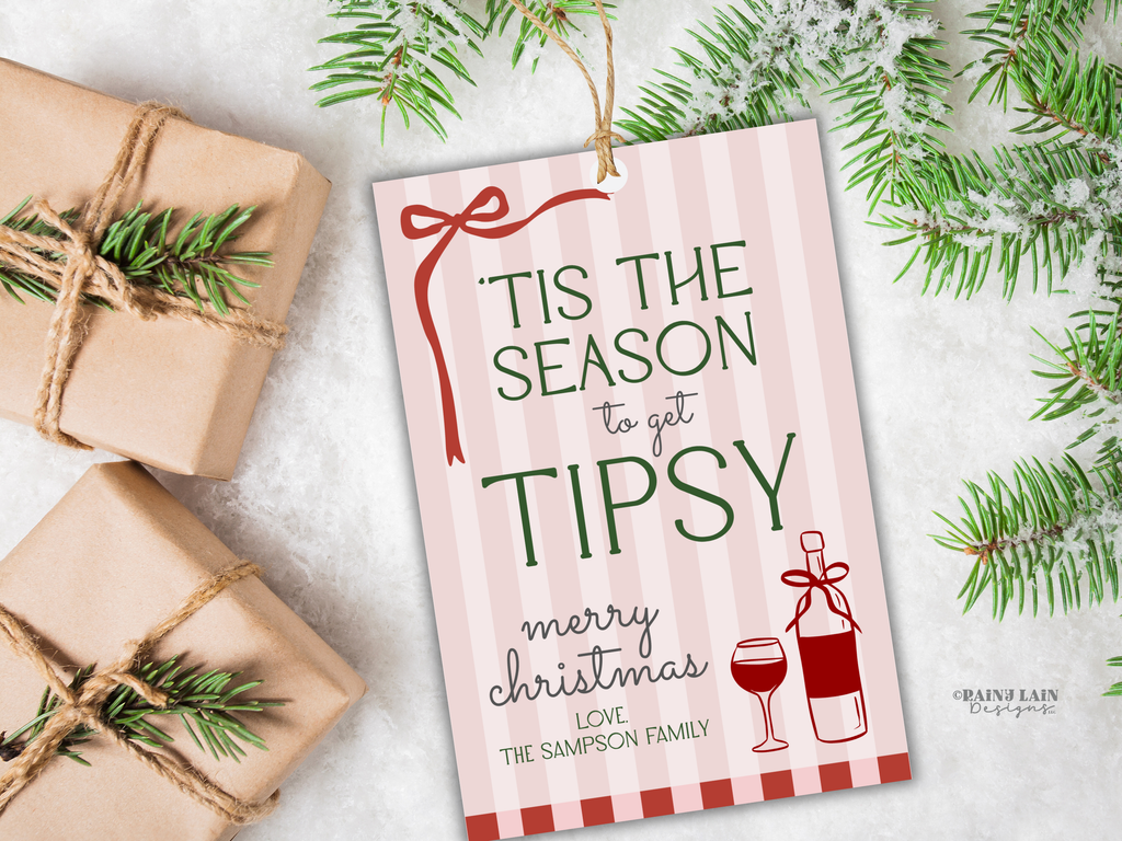 Tis the Season to Get Tipsy Gift Tag Template, Pink Coquette Christmas, Editable in Canva