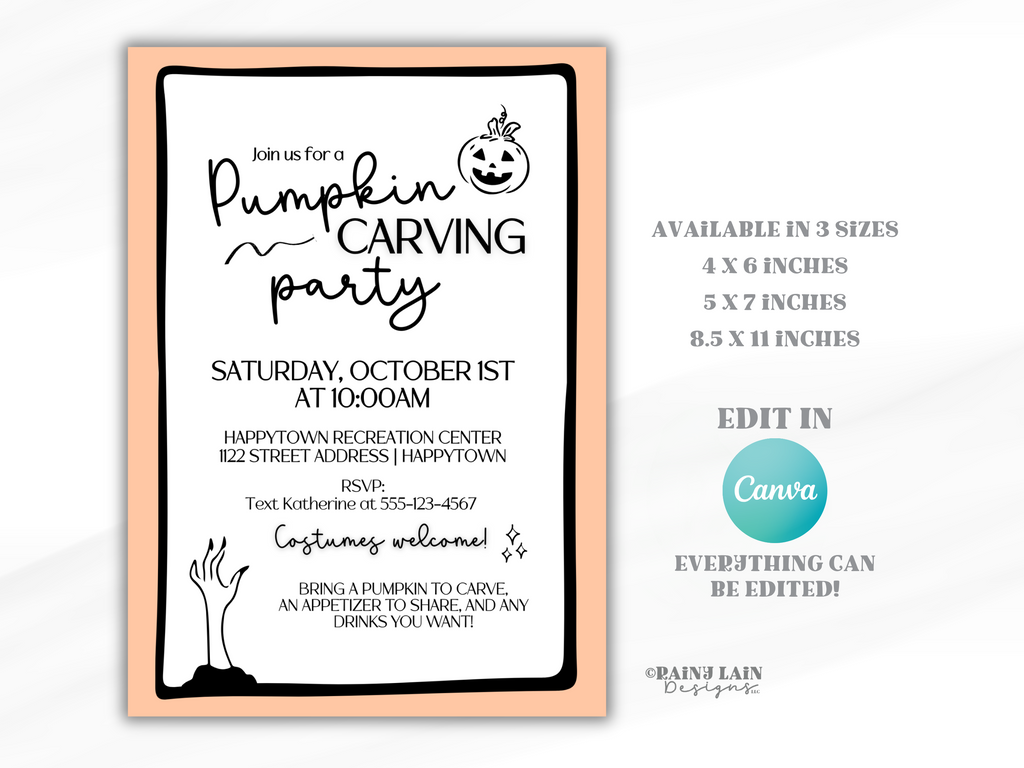 Pumpkin Carving Party Invitation Template, Editable in Canva, Hand drawn doodles