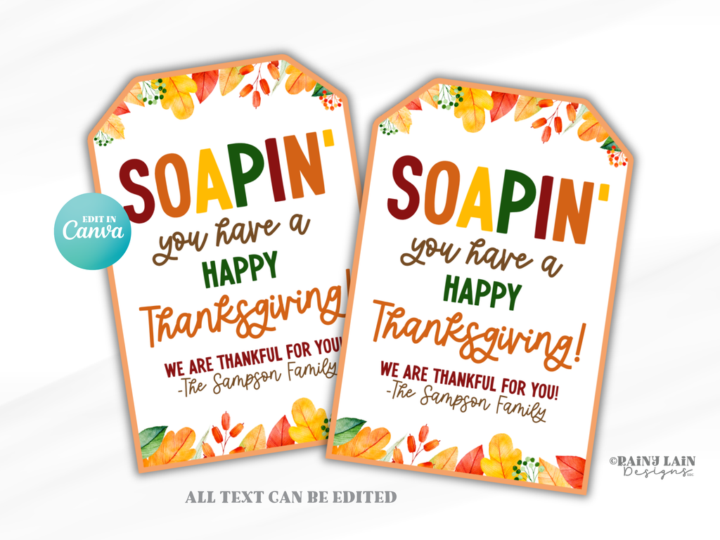 Soapin You have a Happy Thanksgiving Tag, Soap Gift, Editable Printable Canva Template