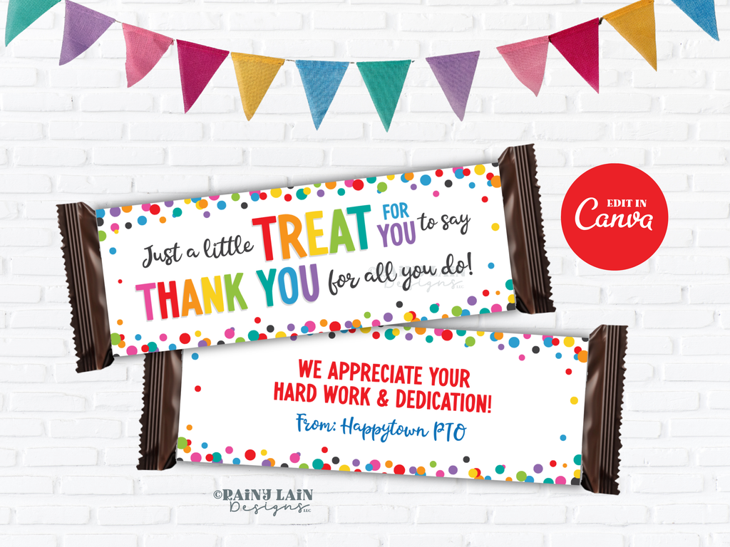 Show your appreciation in a sweet and memorable way with this printable Candy Bar Wrapper appreciation gift. This editable Canva template makes it easy to create thoughtful thank you treats for teachers, school staff, coworkers, employees, volunteers, nurses, and more.